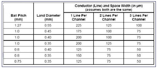 一旦完成了Dog bone型扇出,并且確定了特定的過孔焊盤尺寸,二步就是定義從BGA進(jìn)入電路板內(nèi)層的走線寬度。確認(rèn)走線寬度時要考慮許多因素。表1顯示了走線寬度。走線之間要求的小空間限定了BGA迂回布線空間。重要的是要知道,減小走線之間的空間將增加電路板制造成本。