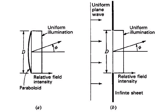 這是假設孔徑的照射度是平均分布的(uniform)。更精確地說,遠場場型是分布在孔徑各處的電場之傅立葉變換,并且考慮到孔徑平面各處之振幅及相位的變動。