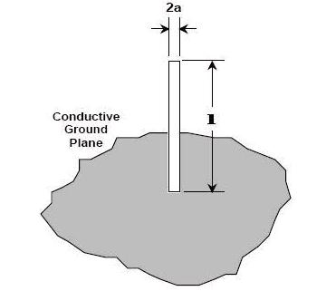雙極的一半,一個四分之一波長單極天線具有輻射電阻R = 36奧姆,可在「半無限導電接地面(semi-infinite conducting ground plane)」上運作,如下圖所示。