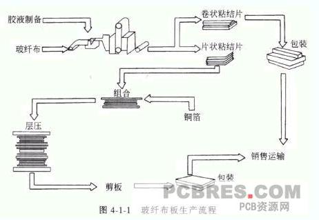 在覆銅板的生產流程中,一般包括:膠液制備、浸膠、粘結片貯存、組合、層壓、成品檢驗(含外部和內部質量檢驗)、剪切包裝等工序。具體見圖4-1-1 (以玻纖布板為例)。