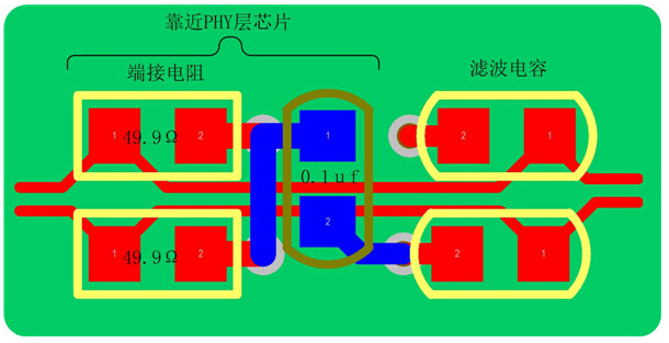 c) 差分信號終端電阻(49.9Ω,有的PHY層芯片可能沒有)必須靠近PHY層芯片的Rx±、Tx±管腳放置,這樣能更好的消除通信電纜中的信號反射;