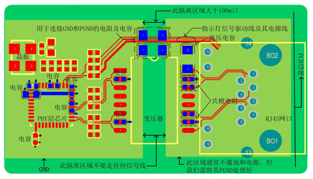 1. 圖 2網口變壓器沒有集成在網口連接器里的參考電路PCB布局、布線圖,下面就以圖 2介紹以太網電路的布局、布線需注意的要點。
